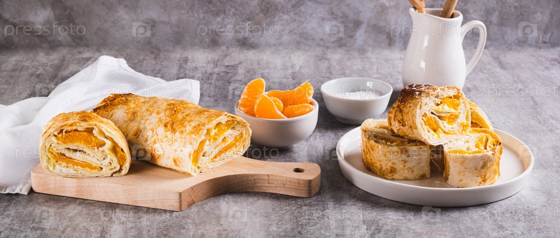 Сладкий рулет из творога с мандарином, завернутый в лаваш, на столе веб-баннер