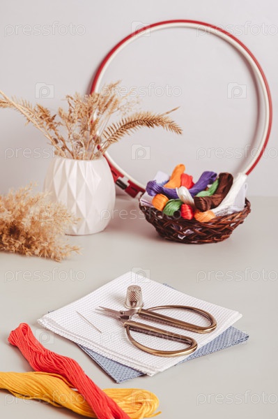 Канва, нитки мулине, ножницы, игла, наперсток и пяльцы для вышивки крестом на столе, вертикальный вид