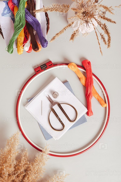 Комплект оборудования для вышивки крестиком на сером фоне вид сверху и вертикально