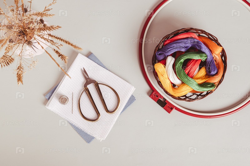 Корзина с цветными нитками мулине и канвой для вышивки на сером фоне вид сверху