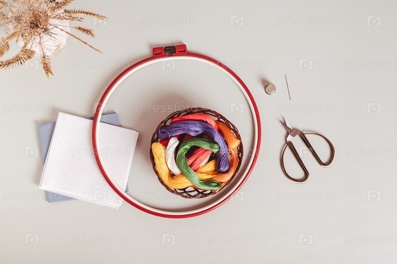 Корзина с цветными нитками мулине, канвой, пяльцами и ножницами на сером фоне, вид сверху