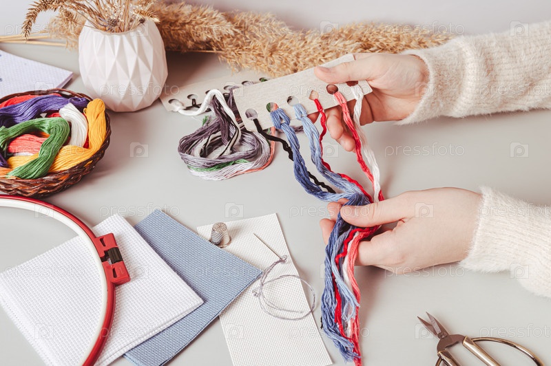Женские руки держат набор цветных ниток мулине на рабочем столе
