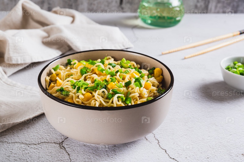 Лапша быстрого приготовления с кукурузой и зеленым луком в миске на столе