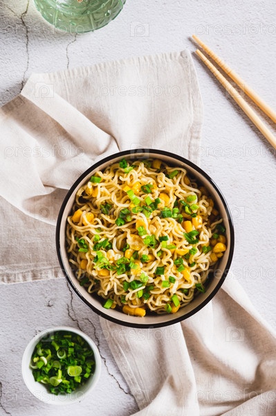 Миска с лапшой быстрого приготовления и овощами на столешнице и вертикальный вид