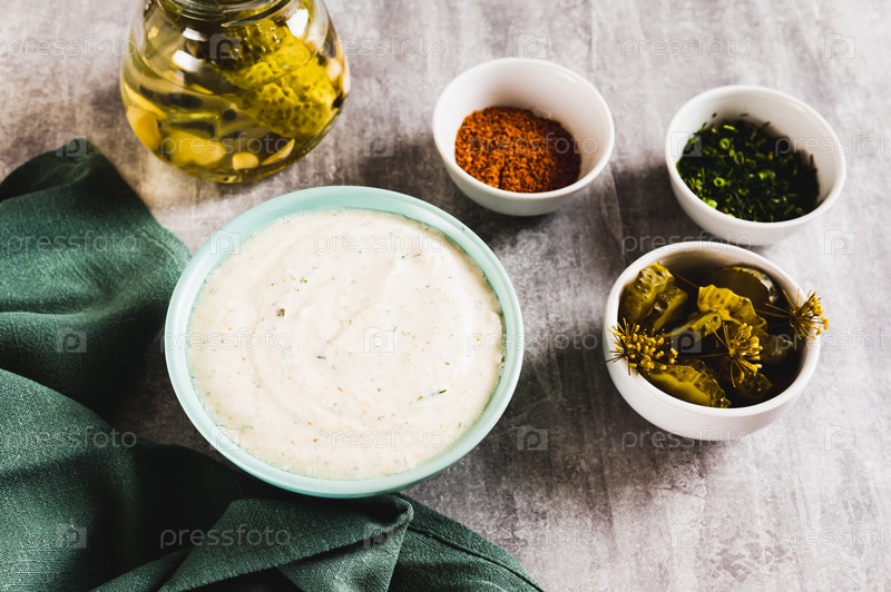 Острый сметанный соус с чесноком в миске на столе