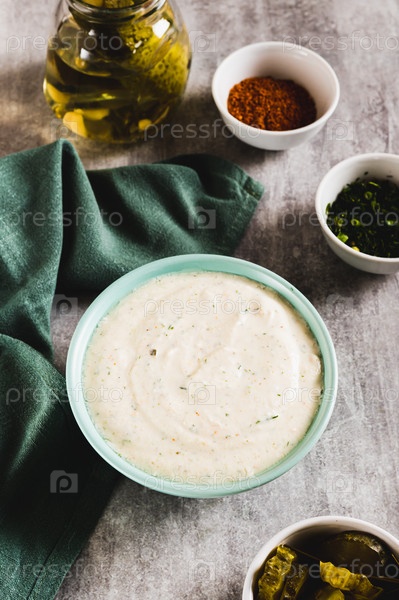 Острый сметанный соус с чесноком в миске на столе вертикальный вид