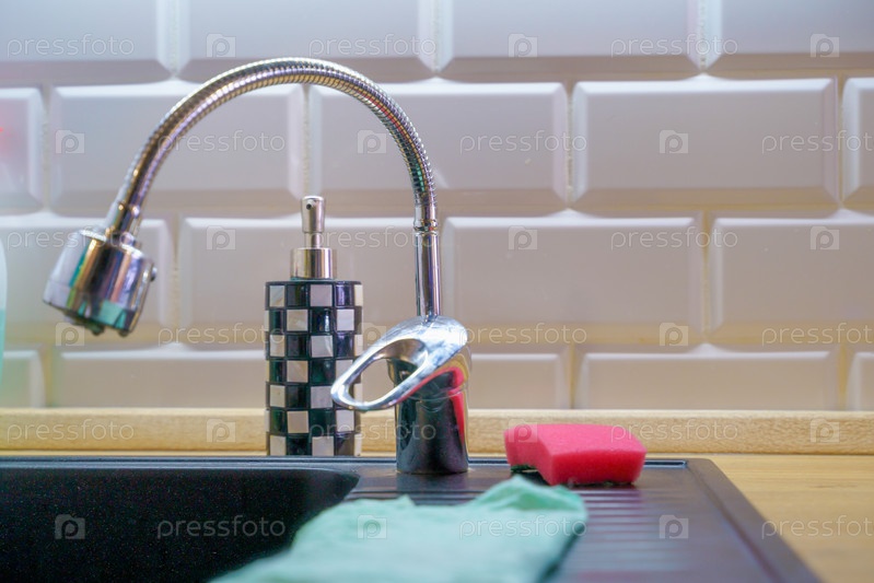 Интерьер кухни, кухонный кран над раковиной, размытый фон