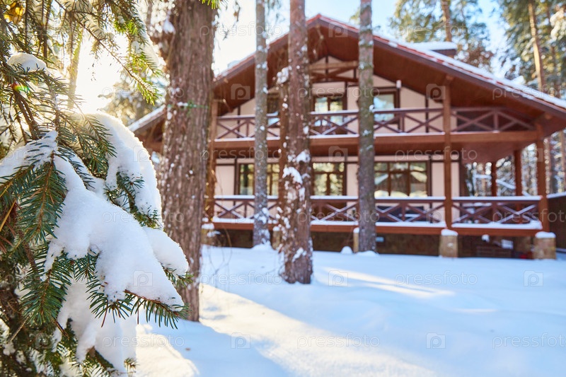 Зимний пейзаж. Ветка сосны в снегу с деревянным домом на заднем плане. Копировать пространство