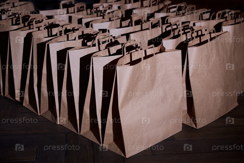Пакеты из крафтовой бумаги. Концепция доставки товаров или еды из магазинов. Место для логотипа или дизайна. Экологичные пакеты