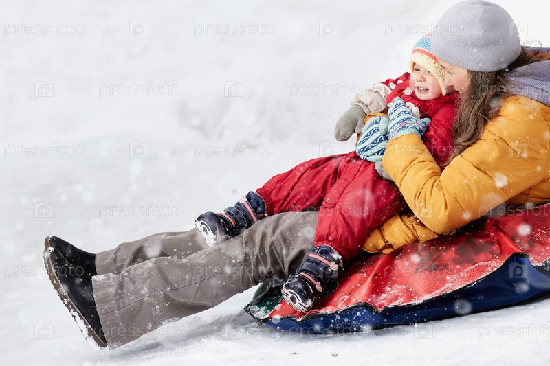 Зимние развлечения. Активная женщина и ее ребенок катаются с горы зимой на тюбинге