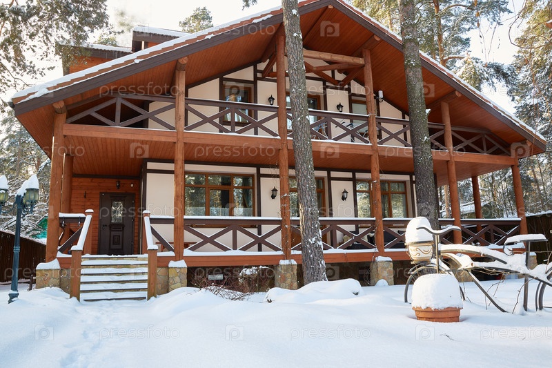 Загородный деревянный дом в снежный зимний день