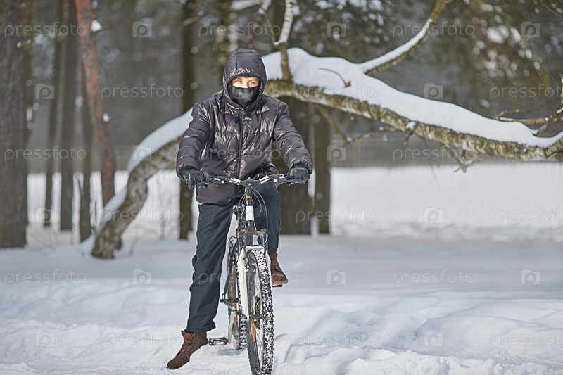 Активный зимний отдых. Подросток в коричневой и черной одежде едет на велосипеде зимой