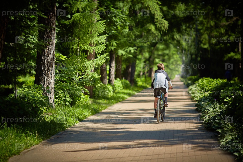 Мужчина едет на велосипеде по дороге в зеленом парке в солнечный летний день. Копировать пространство