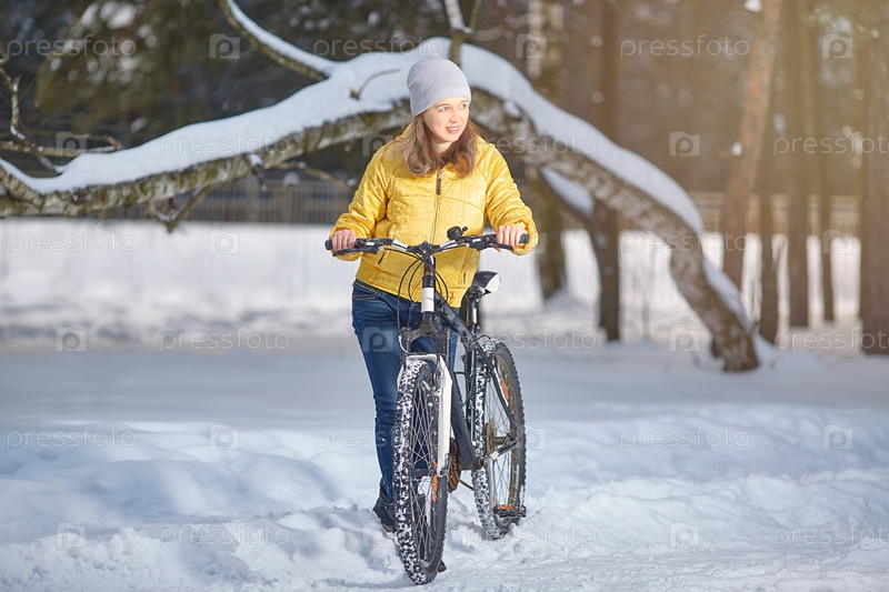 Женщина с велосипедом зимой. Зимние виды спорта. Активный отдых
