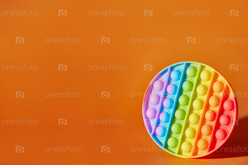 Игрушка Pop it на оранжевом фоне с копией пространства.Популярная разноцветная силиконовая антистресс-игрушка