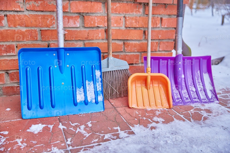 Разноцветные пластиковые лопаты для уборки снега стоят возле кирпичной стены особняка. Семейная концепция уборки дома и территории вокруг дома