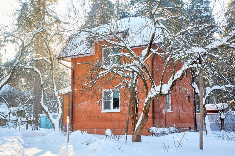 Кирпичный двухэтажный дом в холодный солнечный зимний день