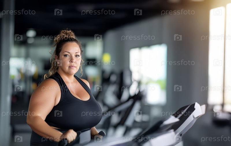 Черная женщина plus size в спортивной одежде тренируется в тренажерном зале, пот течет по ее сосредоточенному лицу