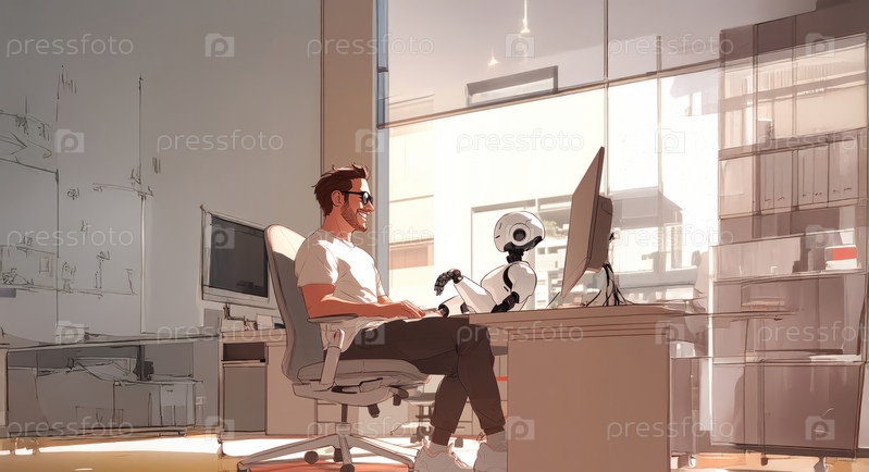Счастливый офисный работник сотрудничает с роботом-помощником при выполнении задач. Сгенерированное изображение