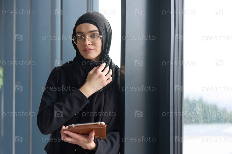 Великолепная мусульманка-бизнесмен запечатлена на портрете крупным планом, держа в руках планшет, демонстрируя свои пленительные зеленые глаза за стильными очками, излучающими элегантность, профессионализм и уверенность