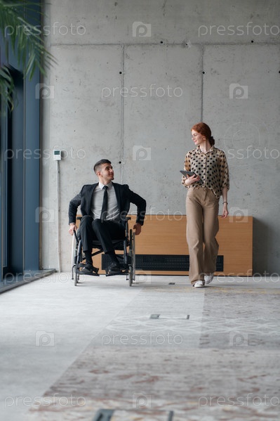 Директор в инвалидной коляске перемещается по офису, обсуждая деловые вопросы с коллегой
