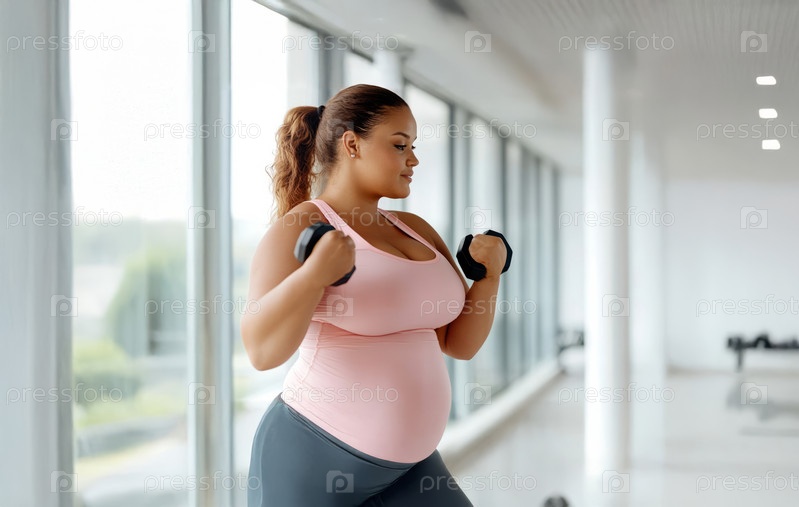 Черная женщина plus size в спортивной одежде тренируется в тренажерном зале, пот течет по ее сосредоточенному лицу