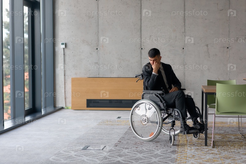 Грустный и подавленный директор в инвалидном кресле сидит один в большом офисе, размышляя о трудностях и изоляции, которые сопутствуют его профессиональным обязанностям