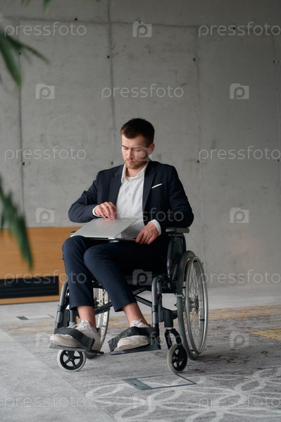 Директор в костюме, сидящий в инвалидном кресле, с мячом в современном офисе, олицетворяющий адаптивность, сосредоточенность и лидерство, справляясь с трудностями на рабочем месте