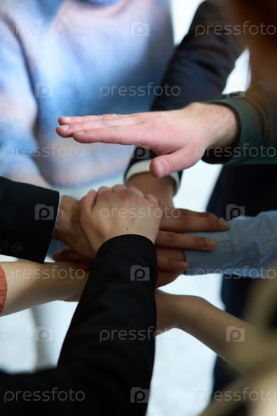 Вид сверху на деловых людей, взявшихся за руки в круг, символизирующий единство, сотрудничество и общий успех на рабочем месте
