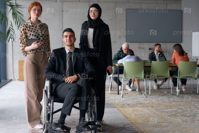 Разнообразная бизнес-команда уверенно позирует, включая улыбающегося директора, сидящего в инвалидном кресле, в окружении двух коллег-женщин, одна из которых в хиджабе, а другая держит планшет, в современной офисной обстановке