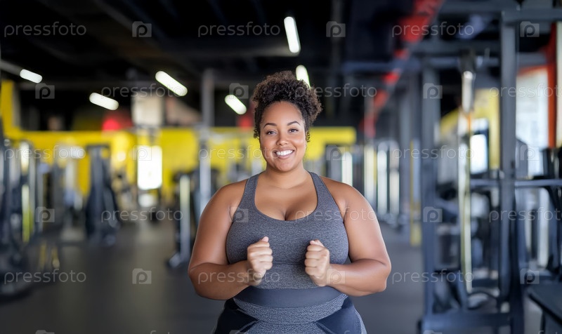 Черная женщина plus size в спортивной одежде тренируется в тренажерном зале, пот течет по ее сосредоточенному лицу