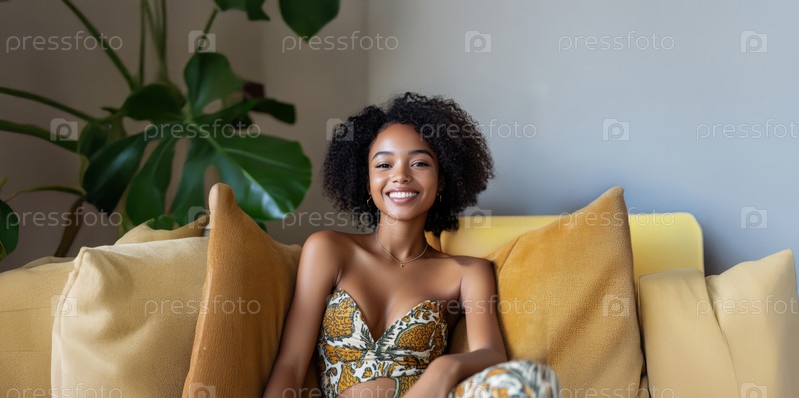 Молодая африканская женщина с витилиго улыбается и отдыхает на диване у себя дома. Сгенерированное изображение