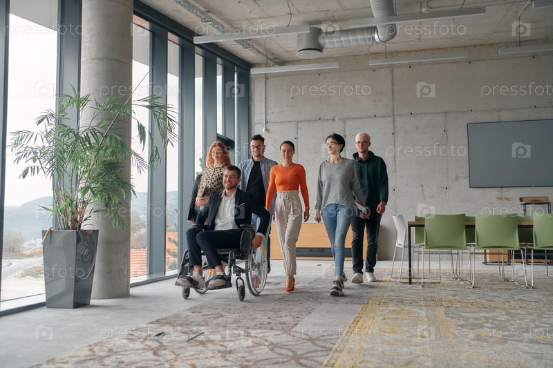 Команда профессионалов бизнеса перемещается по просторному современному офису, помогая своему руководителю, бизнесмену в инвалидной коляске, сотрудничая и перемещаясь по рабочему месту