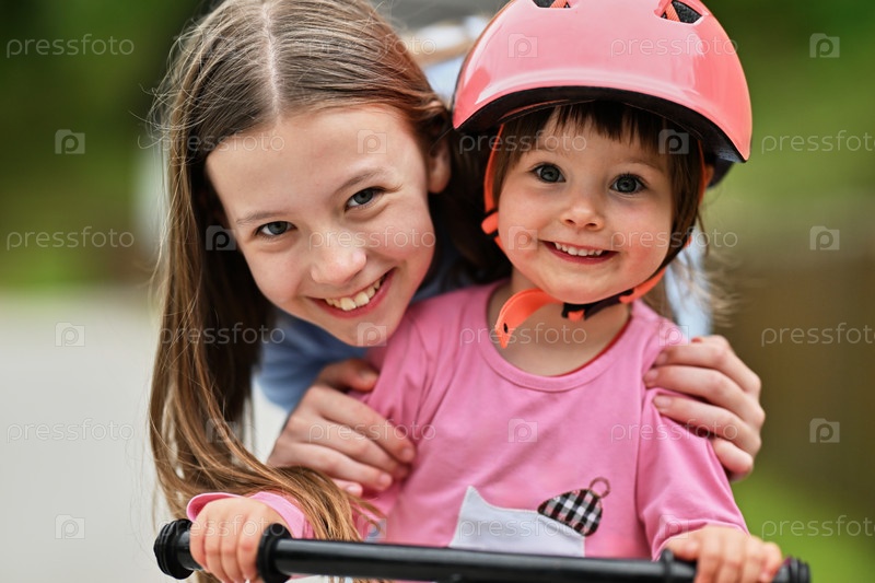 Крупным планом девочка-подросток тепло обнимает молодую девушку в защитном шлеме во время езды на велосипеде на природе