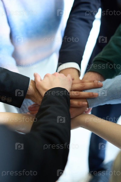 Вид сверху на деловых людей, взявшихся за руки в круг, символизирующий единство, сотрудничество и общий успех на рабочем месте