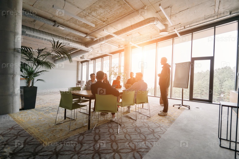 Разнообразная многонациональная бизнес-команда участвует в совместной встрече, обсуждая стратегии и решения в современной офисной обстановке