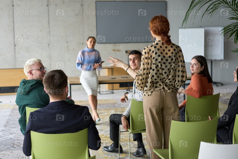 Группа разнообразных деловых людей сосредоточенно сидит в современном офисе, активно участвуя в обучающем занятии под руководством инструктора, уделяя особое внимание последним технологическим достижениям в мире бизнеса
