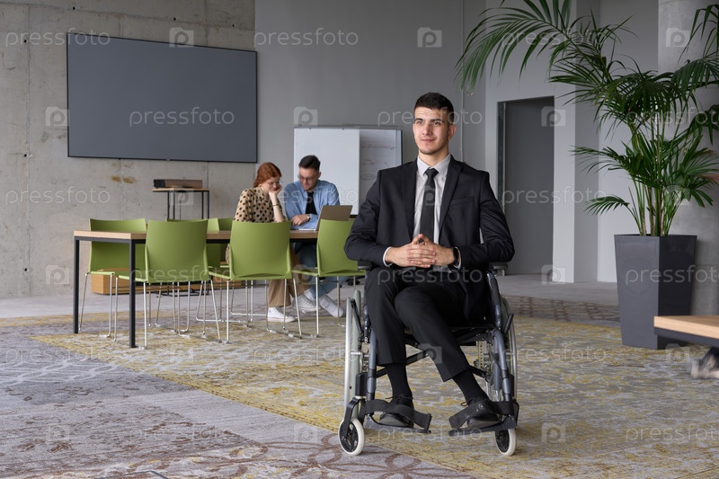 Бизнес-директор в костюме, передвигающийся в инвалидной коляске, с коллегами, проводящими совещание позади него