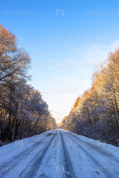 Скользкая замерзшая дорога в лесу в солнечный зимний день