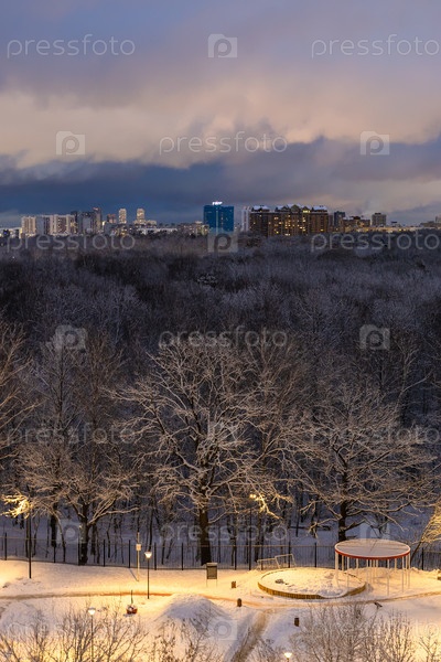 Городской парк и дома на горизонте зимней ночью