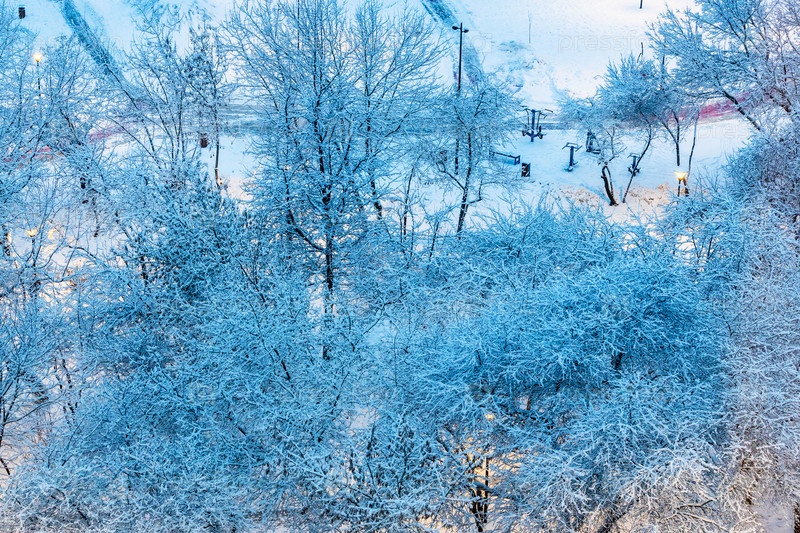 Заснеженное дерево в городском парке в синих зимних сумерках