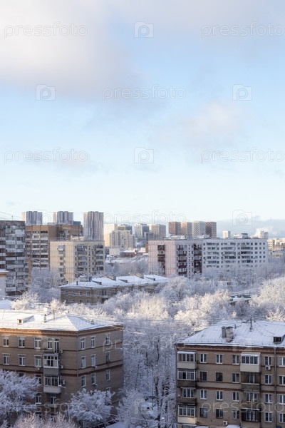 Жилые дома в городе после снегопада зимой