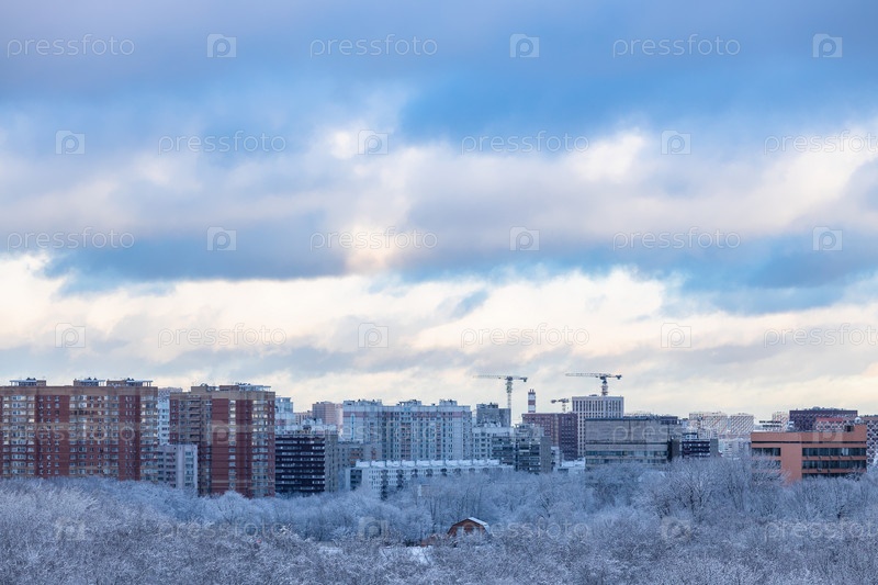 Снежные облака над городским парком зимним вечером