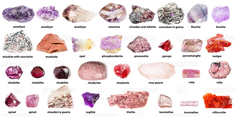Необработанные розовые минералы с названиями изолированы
