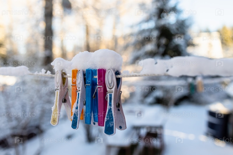 Заснеженные прищепки крупным планом на заднем дворе