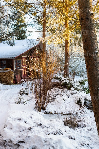 Вид на деревянную хижину с поленницей в заснеженном дворе