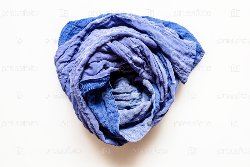 Вид сверху на свернутый синий лоскутный шарф на белом