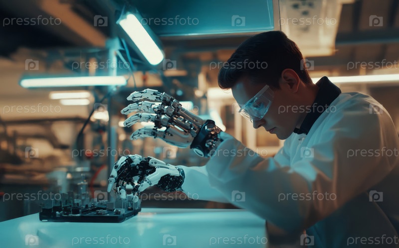 Инженер-робототехник калибрует роботизированный протез руки, демонстрируя передовые медицинские технологии. Сгенерированное изображение