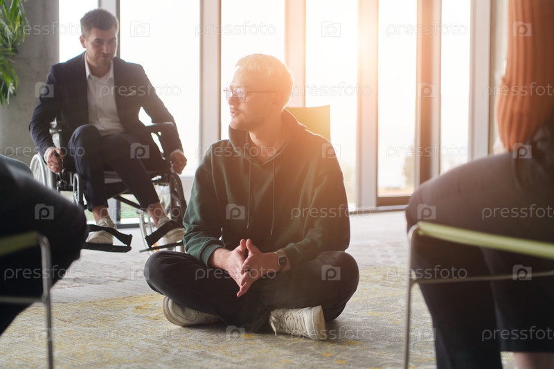 Корпоративная встреча бизнес-команды с менеджером или тренером. Группа счастливых разнообразных, многорасовых людей, сидящих в кругу