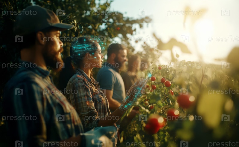 Разнообразная группа фермеров изучает технологию интеллектуального земледелия в поле осенью. Сгенерированное изображение